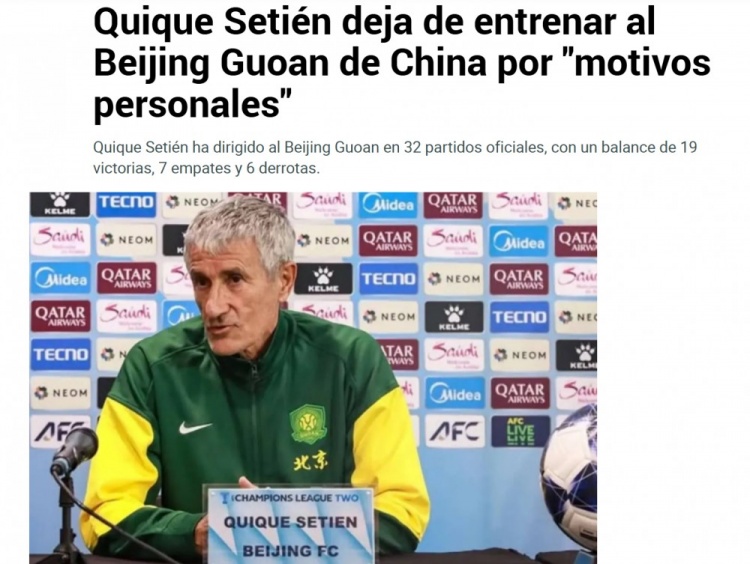 10月6日讯 日前,西班牙媒体《马卡报》、《世界体育报》报道了北京国安主帅塞蒂恩因“个人及家庭原因”辞职的消息。
