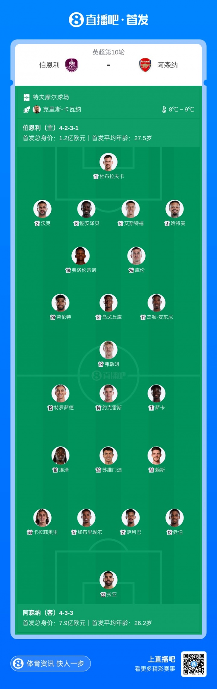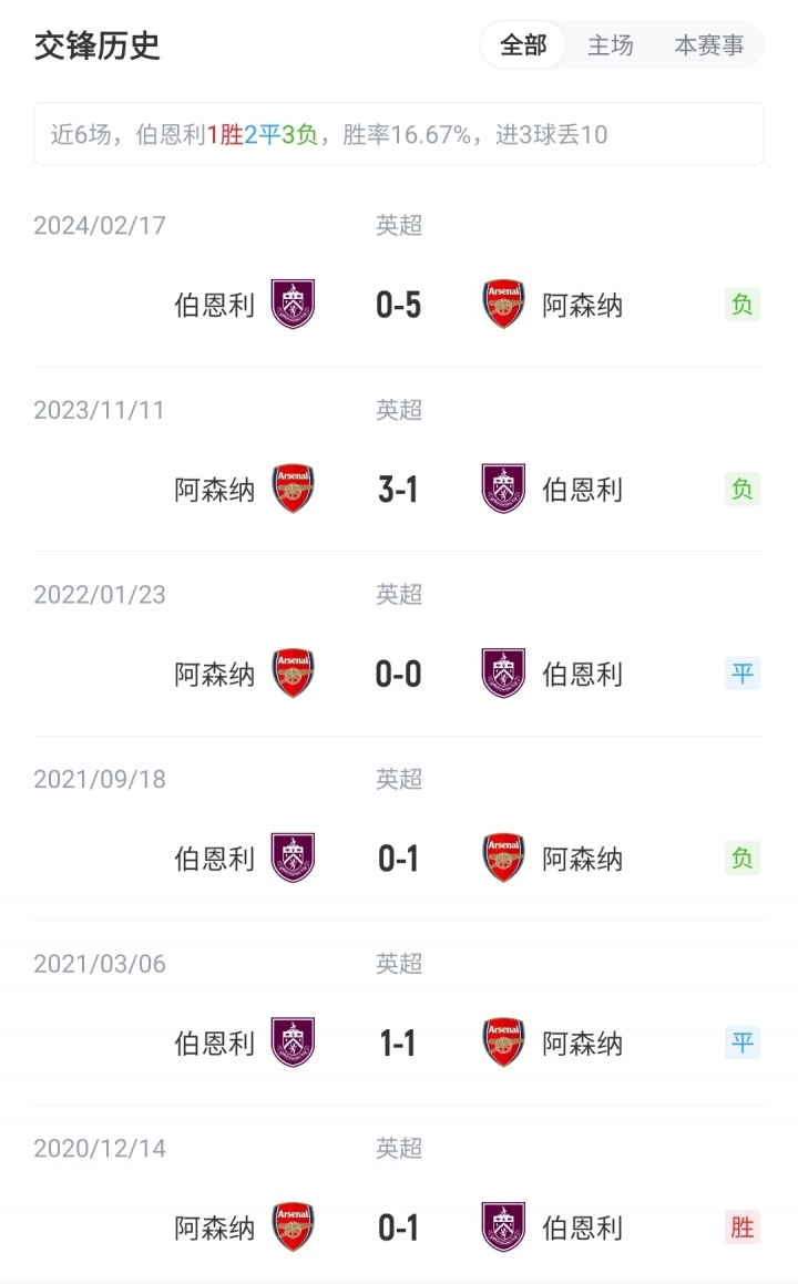 目前英超积分榜上,阿森纳7胜1平1负积22分,位列榜首;伯恩利3胜1平5负积10分,位列第16。