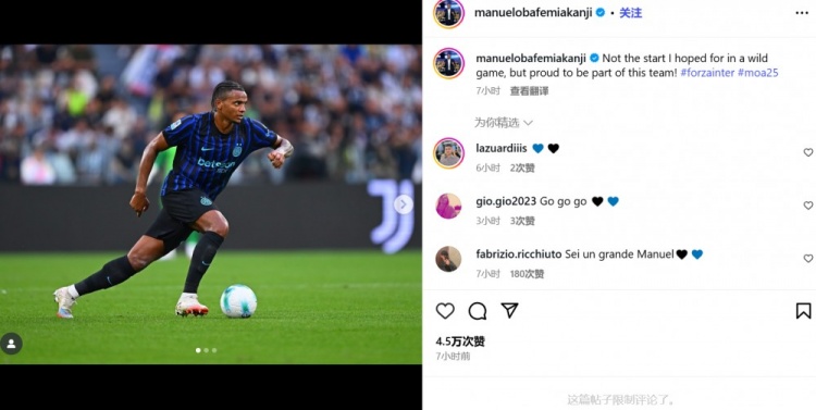 9月14日讯 在国米客场应战 3-4输给尤文后,阿坎吉更新了社交媒体,纪念自己的国米生涯首秀。