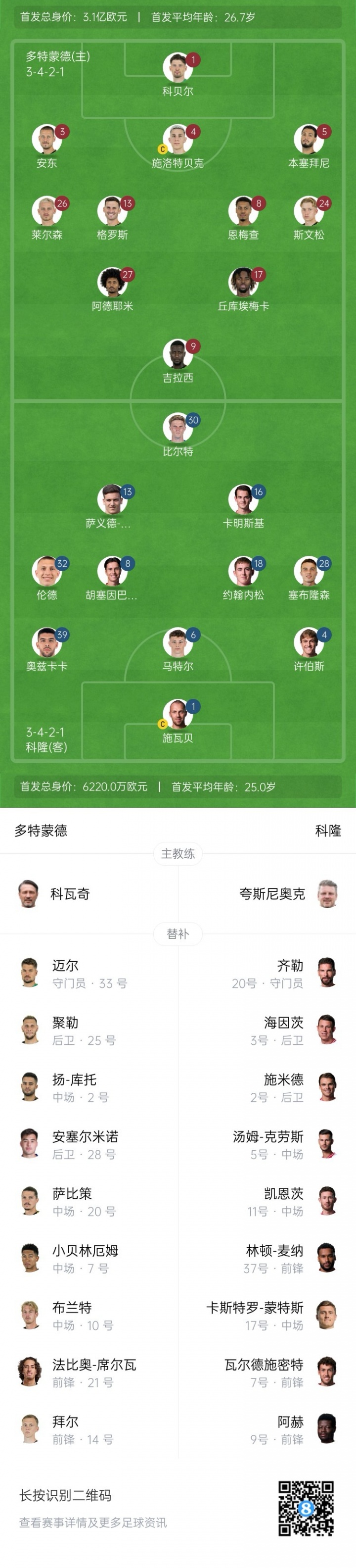 科隆杆位:1-施瓦贝、39-奥兹卡卡、6-马特尔、4-许伯斯、32-伦德、8-胡塞因巴西奇、18-约翰内松、28-塞布隆森、13-萨义德·马拉、16-卡明斯基、30-比尔特