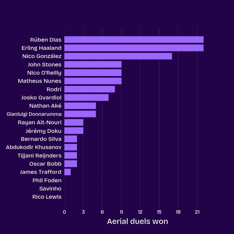 10月31日讯 数据机构squakwa统计了本赛季曼城队内的英超成功争顶情况,哈兰德和鲁本-迪亚斯并列最多。